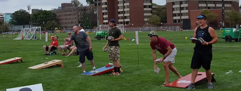 Cornhole is a staple at any celebration. It can be played individually or in teams of two. Two wooden blocks with a small holes in them sit on either side of a field. Players take turns throwing bean bags onto the cornhole board. A bean bag that lands on the board earn that team one point, and a bean bag that lands inside the hole earn that team three points. The game is played until either team makes it to twenty-one points.